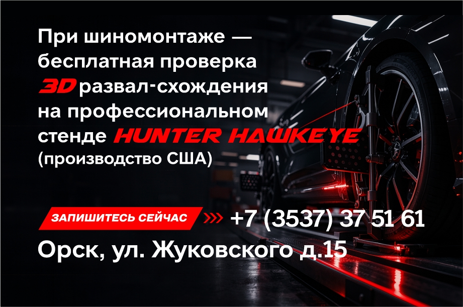 При шиномонтаже – бесплатная проверка 3D развал-схождение на профессиональном стенде HUNTER HAWKEYE (производство США).